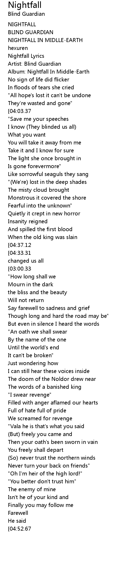 Lyrics to Nightfall by Blind Guardian from the Nightfall in Middle-Earth album - including song video artist biography translations and more. Kursch No sign of life did flicker In floods of tears she cried All hopes lost it cant be undone Theyre wasted and gone Save me your speeches I know They blinded us all What you want You will take it away from me Take it and I know for sure The light she once brought in Is gone forevermore Like sorrowful seaguls they sang. Legacy of the Dark Lands 2019.